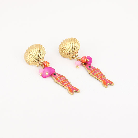 Oorbellen met schelp & oranje kraaltje | Goudkleurig