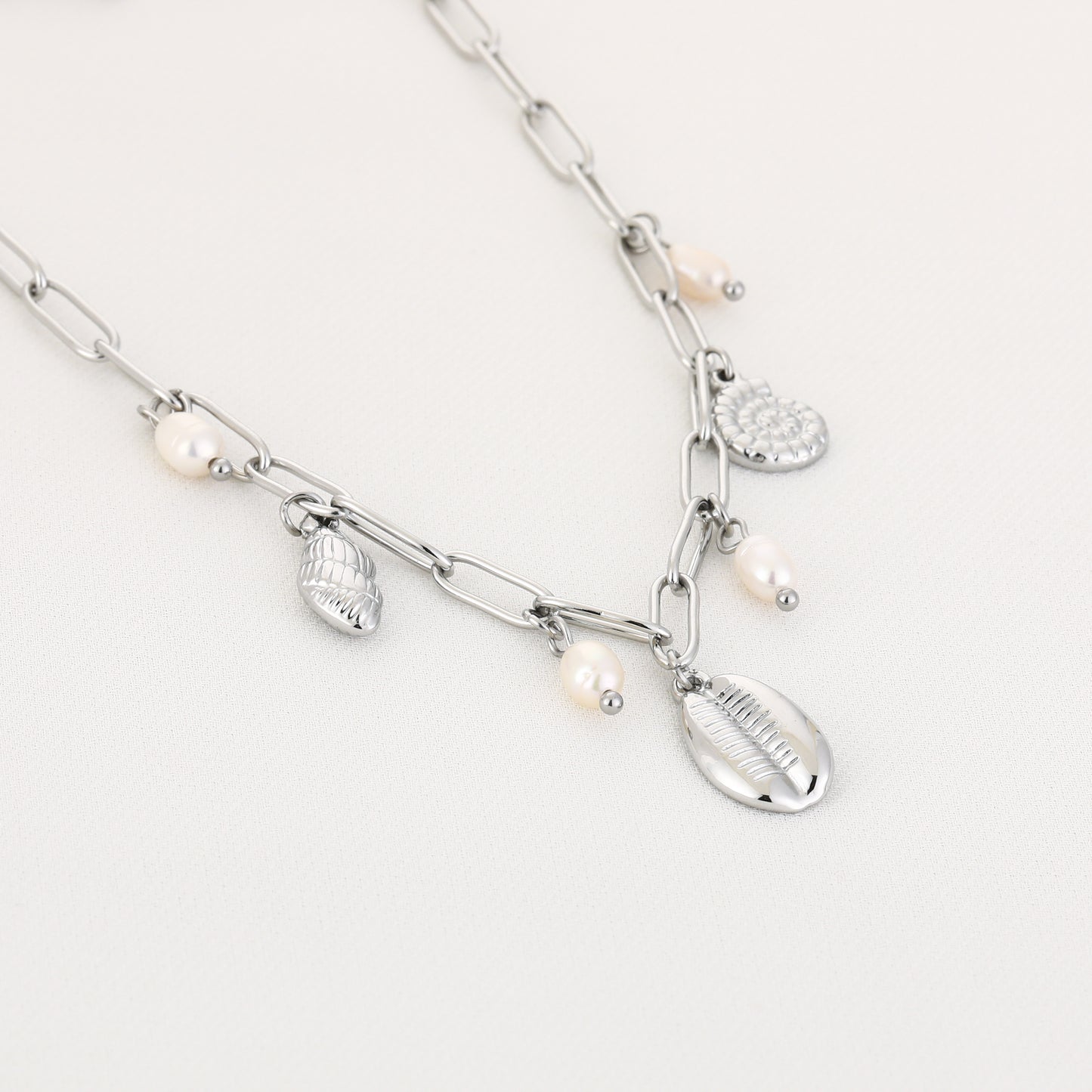 Op zoek naar een leuke zomerse ketting die overal bij past? Deze zilverkleurige bedelketting met schelpjes en pareltjes is subtiel en perfect voor de zomer. Deze schelpen bedelketting heeft wat grotere schakels. 🐚✨