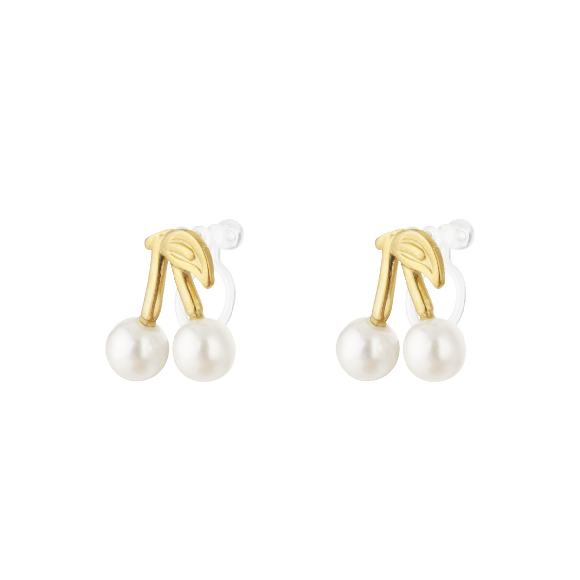 Clip oorbellen met kersjes en parels | Goudkleurig
