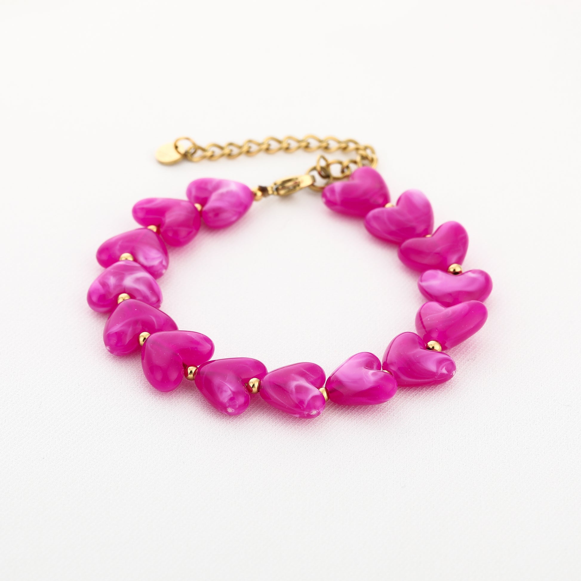 Maak je look extra vrolijk met deze kralen armband met hartjes in goud en fuchsia! Deze kralenarmband bestaat uit hartjes kralen met daar tussen gouden kraaltjes. De armband is gemaakt van stainless steel en stevige kralen. Hij is waterproof en verkleurt niet, dus je kunt hem zonder zorgen dragen tijdens het zwemmen, douchen of op vakantie.