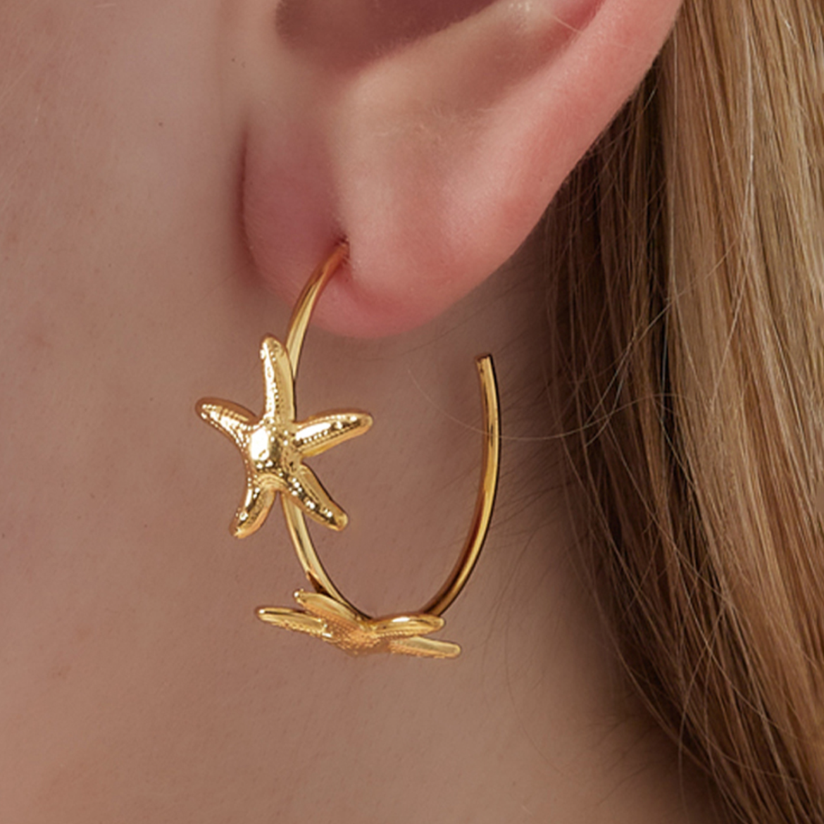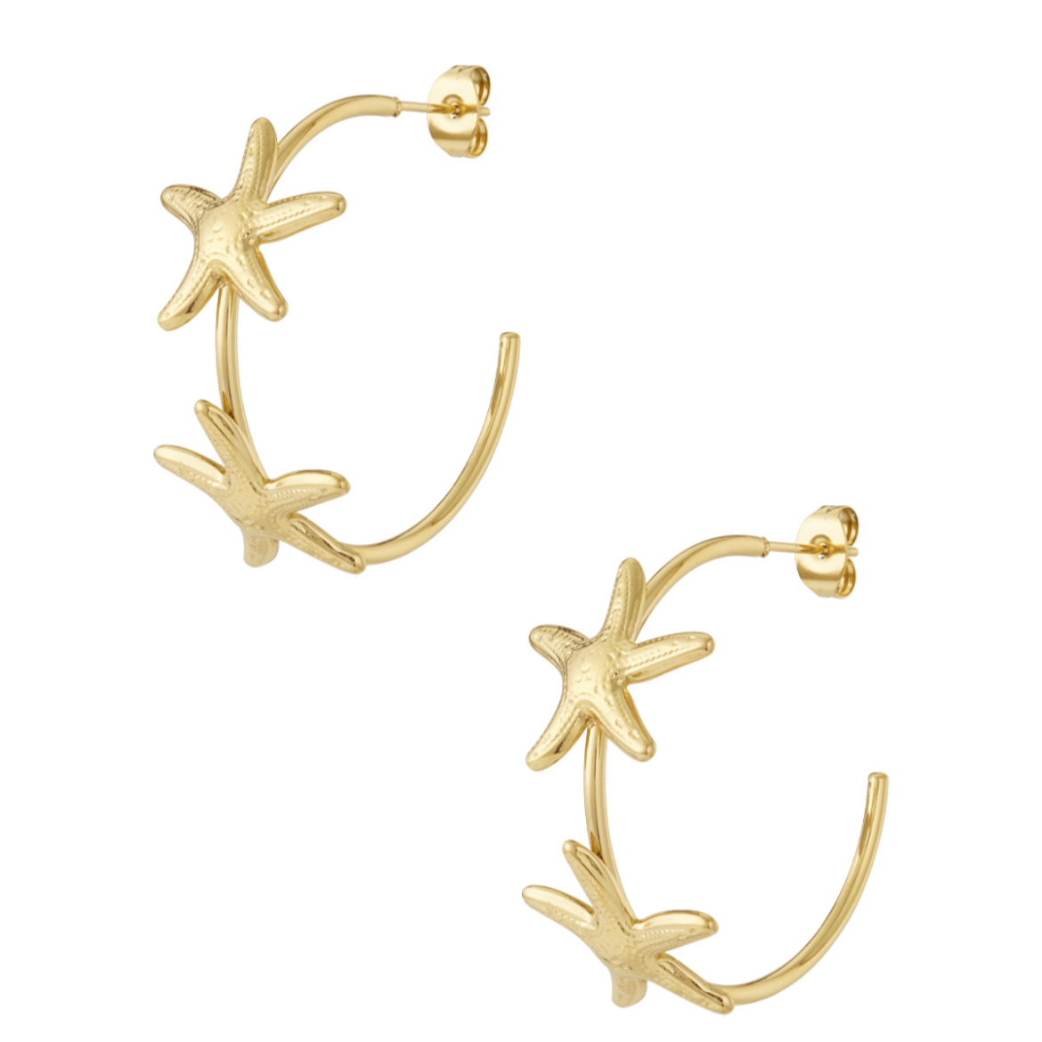 Op zoek naar leuke oorbellen voor de zomer? Deze goudkleurige oorringen met een zeesterren zijn té leuk. Deze oorringen hebben een diameter van ongeveer 3 centimeter. Combineer met andere oorbellen uit onze travel collection voor een leuke earparty. De oorbellen zijn gemaakt van stainless steel en dus waterproof. 🌞